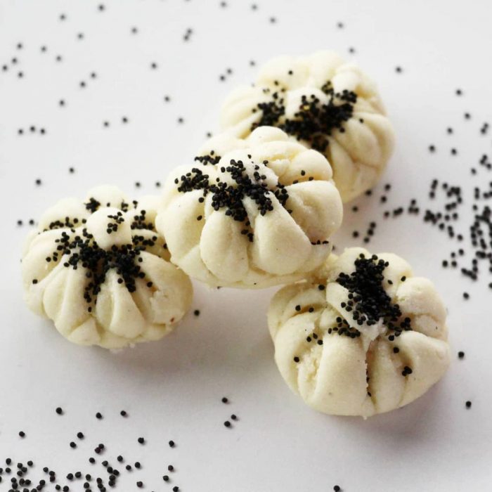 سپس گلوله کوچکی از خمیر را در دست گرد کرده و به دلخواه به آن طرح می دهیم (می توان از انگشت دانه استفاده کرد)آبدندان سفید با سیاه دانه و زعفرانی با پودر پسته تزیین می شود.