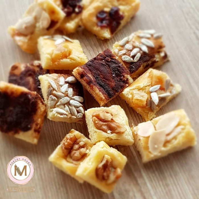 خمیر را از فریزر خارج کرده 1ساعت در دمای محیط قرار می دهیم تا نرم شود. 1کیلو خمیر را به طور یکنواخت کف یک قالب 30*40 پهن می کنیم و با استفاده از قلمو تمام سطح خمیر را آغشته به سفیده ی تخم مرغ کرده سپس از مغز های دلخواه برای تزئین استفاده می کنیم و با چنگال در سطح خمیر سوراخ ایجاد می کنیم.
