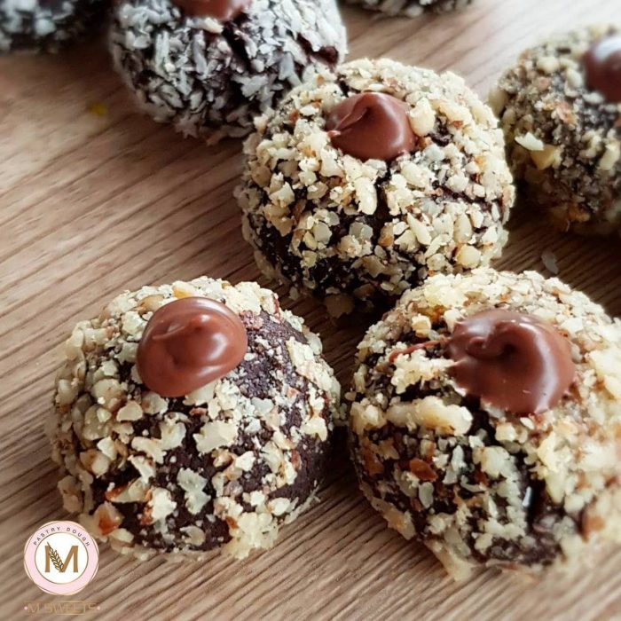 سپس یک گلوله از خمیر را به اندازه ی یک گردوی کوچک برداشته و در سفیده ی تخم مرغ و سپس گردوی خرد شده ی تست شده می غلتانیم و در سینی فر با فاصله قرار می دهیم. توسط سمبه یک حفره وسط خمیر ایجاد می کنیم و در دمای 170 درجه در طبقه وسط فر به مدت10 الی 15 دقیقه می پزیم،پس از در آوردن شیرینی از فر وقتی داغ هستند حفره های شیرینی را با سمبه عمیق تر می کنیم پس از خنک شدن شیرینی حفره ها را با نوتلا پر می کنیم.