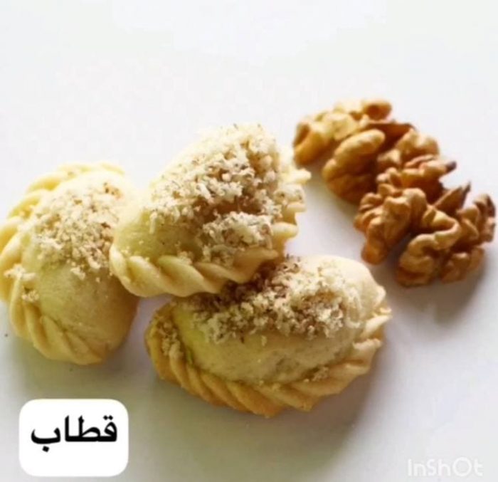 *برای راحتی کار به جای پیچ زدن میتوانید با چنگال لبه های قطاب را شکل دهید. شیرینی ها را در سینی فر قرارداده،برای خمیر سفید از پودر گردو و برای خمیر زعفرانی از پودر پسته جهت تزئین استفاده می کنیم.