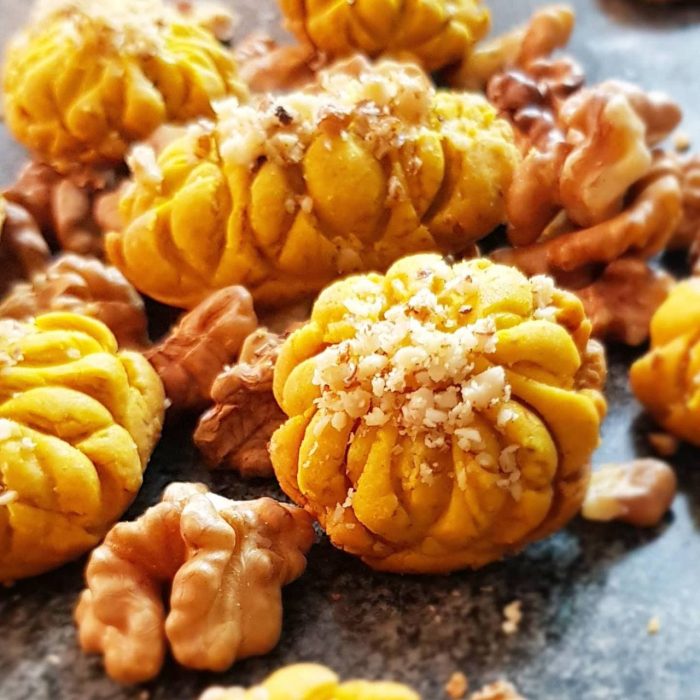 ابتدا به ازای یک کیلو خمیر 300 گرم مغز گردو را تست و خرد کنید سپس خمیر را از فریزر در آورده پس از آنکه به دمای محیط رسید از خمیریک گلوله به اندازه دلخواه برداشته ورز می دهیم یک گودی وسط خمیر ایجاد کرده و مجدد خمیر را بین دو دست گلوله کرده از انواع مهر ها و انگشت دانه برای طرح وی شیرینی می توانید استفاده کنید.